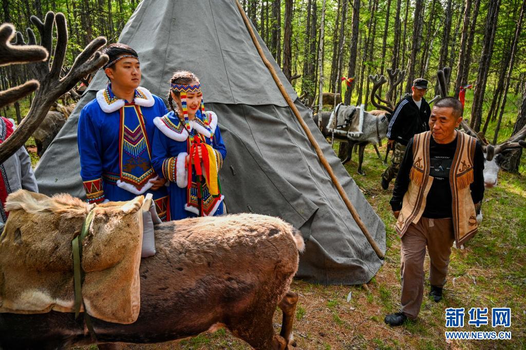6月8日,在内蒙古根河市敖鲁古雅鄂温克族乡的一片森林中,当地的鄂温克族人举办了一场传统婚礼。驯鹿驮着新娘、载着嫁妆,行进在森林里,鄂温克族人载歌载舞。新娘是敖鲁古雅鄂温克使鹿部落老人玛利亚·索的孙女何琦韩,这是多年来使鹿部落少有的传统婚礼。