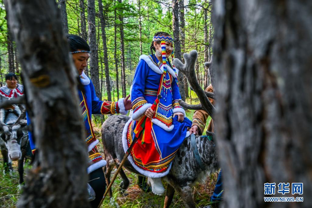 6月8日,新娘何琦韩骑着驯鹿在森林中行进。新华社记者 刘磊 摄