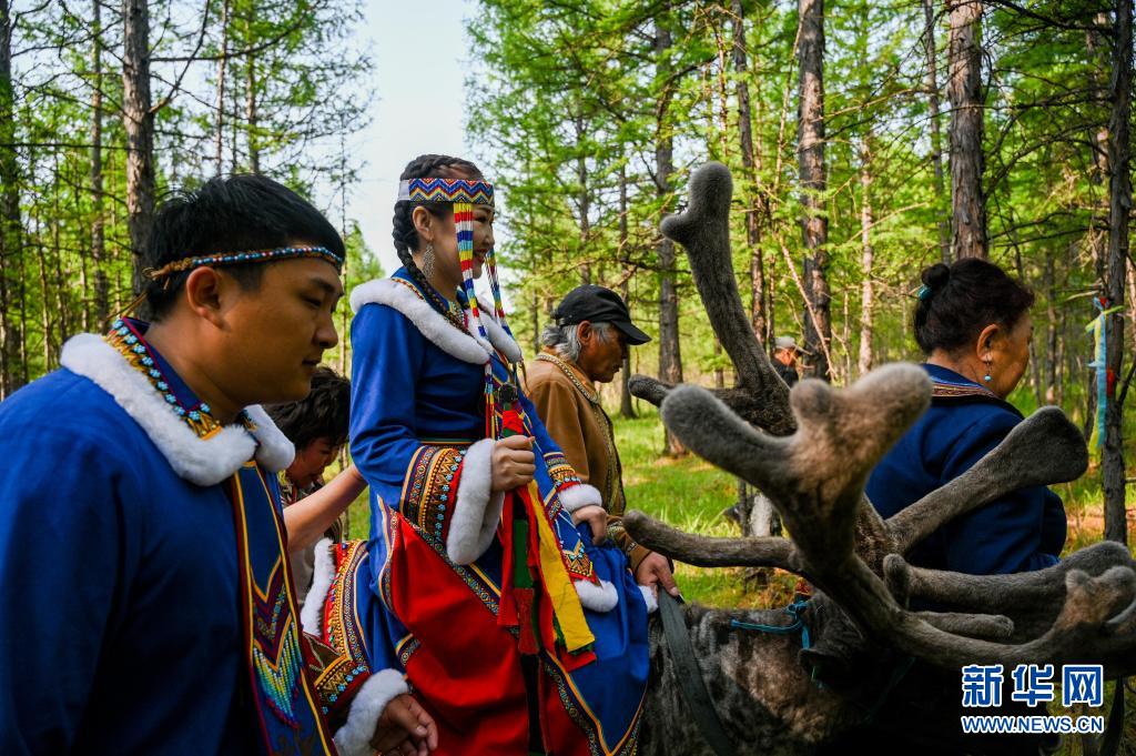 6月8日,在内蒙古根河市敖鲁古雅鄂温克族乡的一片森林中,当地的鄂温克族人举办了一场传统婚礼。驯鹿驮着新娘、载着嫁妆,行进在森林里,鄂温克族人载歌载舞。新娘是敖鲁古雅鄂温克使鹿部落老人玛利亚·索的孙女何琦韩,这是多年来使鹿部落少有的传统婚礼。