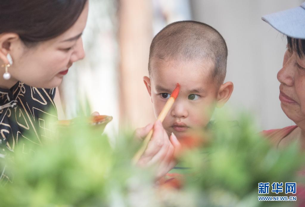 6月11日,屈原故里湖北秭归县的居民在给孩子涂抹雄黄酒。当日,2021屈原故里端午文化节在湖北省宜昌市秭归县开幕,多地游人到屈原故里,体验端午习俗,感受传统文化的魅力。秭归县的居民往往从农历四月底开始忙碌——泡糯米、杀鸡鸭、扫庭院、备锣鼓、修龙舟……到了端午节前夕,用划龙舟、扎香囊、包粽子等民间习俗活动迎接端午佳节,热闹的节日气氛一直持续约20天。新华社记者 肖艺九 摄