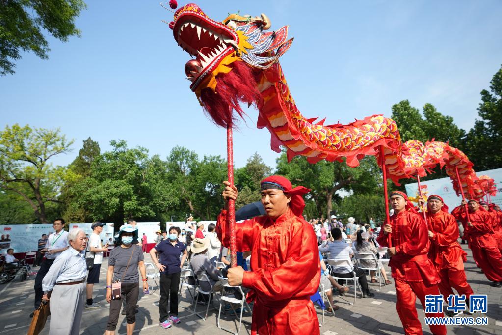 6月12日,在北京龙潭公园,表演者在表演舞龙。当日,“和满京城 奋进九州”2021龙潭端午文化节在北京龙潭公园举办,通过龙舟比赛、文艺演出、民俗体验、非遗展示等多种形式,再现多彩端午民俗,吸引市民游客前来参观游玩。新华社记者 鞠焕宗 摄