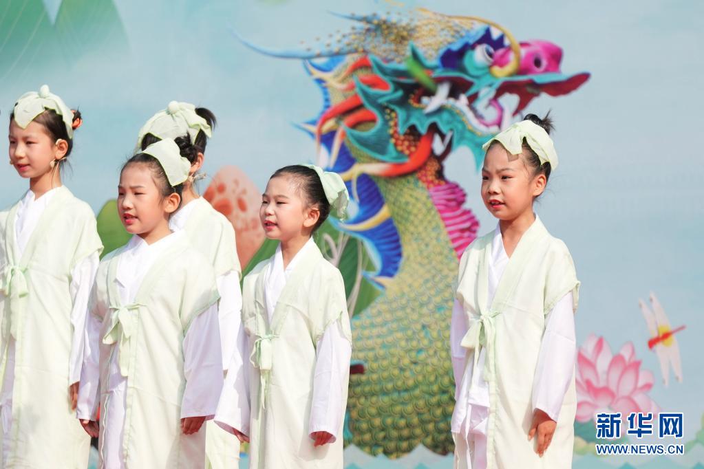 6月12日,在北京龙潭公园,小朋友在朗诵《端午的故事》。当日,“和满京城 奋进九州”2021龙潭端午文化节在北京龙潭公园举办,通过龙舟比赛、文艺演出、民俗体验、非遗展示等多种形式,再现多彩端午民俗,吸引市民游客前来参观游玩。新华社记者 鞠焕宗 摄