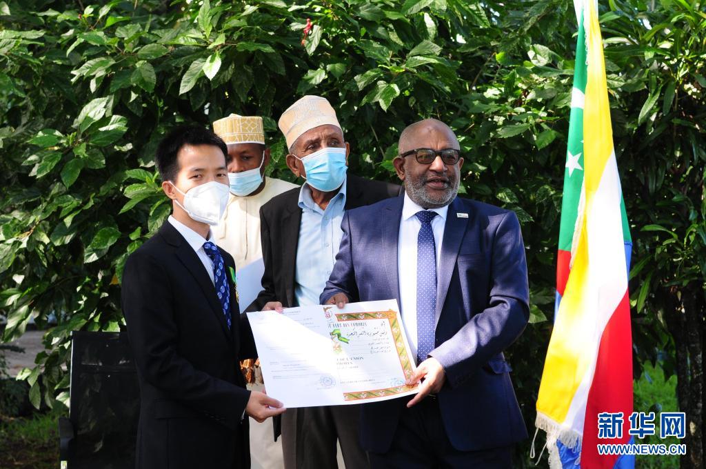 科摩罗总统阿扎利15日在首都莫罗尼的总统府举行仪式,授予中国援科短期抗疫医疗队两名队员“绿新月骑士”勋章,并向其余10名队员颁发荣誉证书。新华社发(王春光摄)