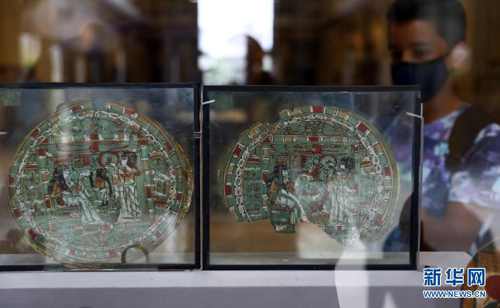 这是6月21日在位于埃及首都开罗的埃及博物馆拍摄的用作鼓皮的彩绘羊皮纸。