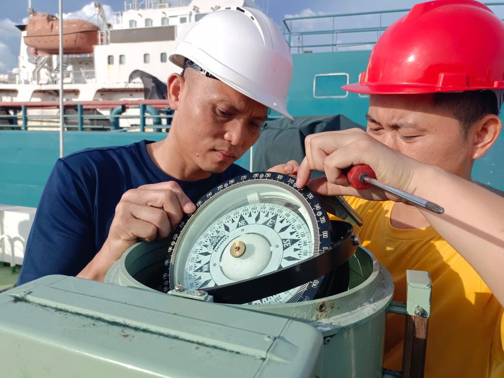卢伟(左一)在三沙综合执法2号船上工作。(受访者供图)