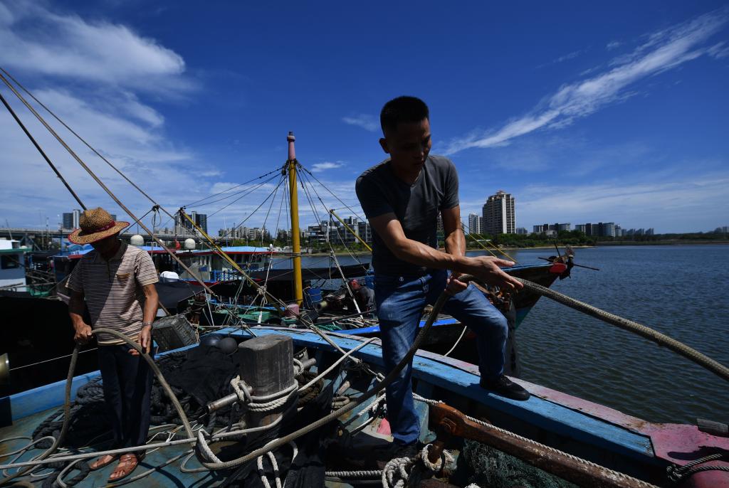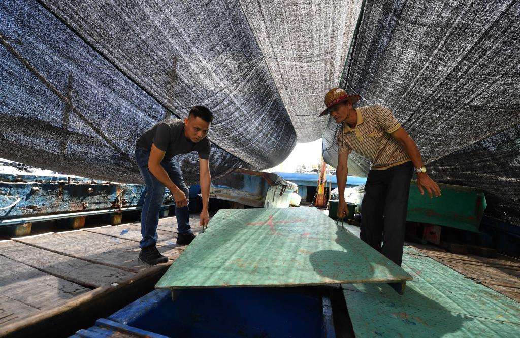 卢伟帮助父亲打理自家的渔船。(新华社记者郭程摄)