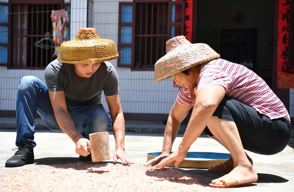 卢伟休假回家帮助母亲晾晒农产品。(新华社记者郭程摄)