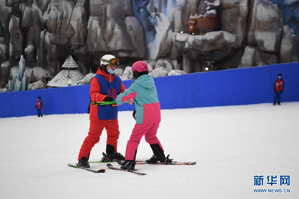 游客(右)在湘江欢乐城内学习滑雪(2020年7月11日摄)。湘江欢乐城所在地原是一座巨大的废弃矿坑,历经6年建设,建成总面积约3万平方米的大型室内滑雪场。新华社记者 薛宇舸 摄