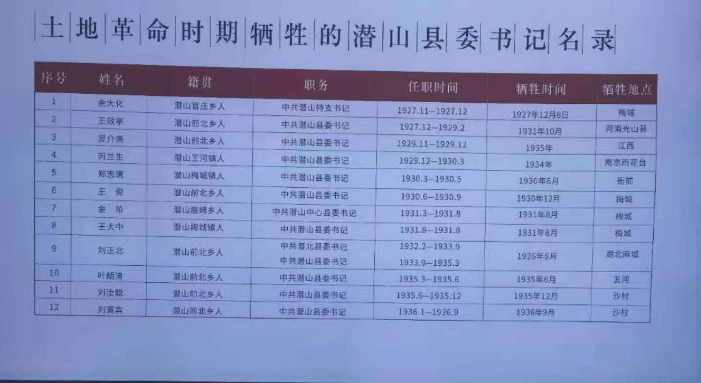 土地革命时期牺牲的潜山县委书记名录。(潜山市委党史和地方志研究室提供)