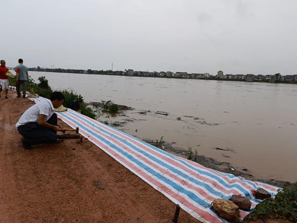 受近日强降雨影响,江西省鄱阳县古县渡镇内河道水位急剧上涨,多段圩堤超警戒水位。48岁的村干部程松发才值完一个通宵班,稍稍休整后,又赶到值守点。“作为党员干部,这个时候必须冲在最前面。”他说。