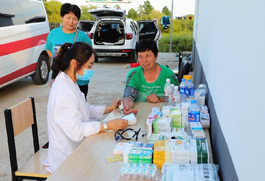 黑龙江省呼玛县三卡乡老道店村一处灾民临时安置点,医护人员为村民测量血压。(受访者供图)