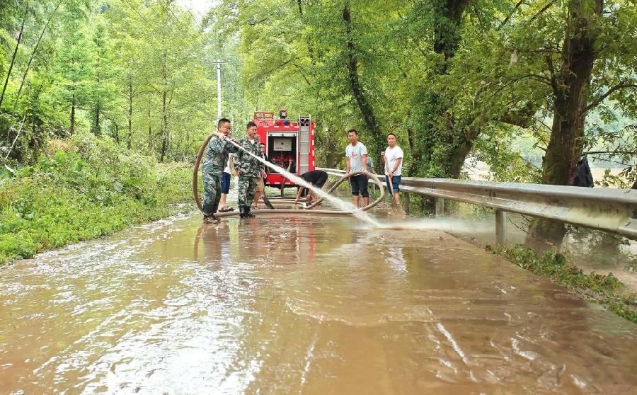 洪水退去后,湖南省泸溪县组织人员对道路淤泥进行清洗。(受访者供图)