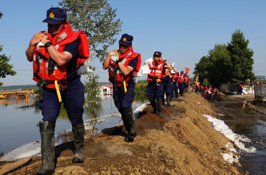 在呼玛县城的河堤上,参与巡堤处险的党员干部无疑是“最闪亮的星”。记者看到呼玛县消防救援大队大队长孙永浩时,他正和队友们在管涌处置现场扛沙袋。蚊虫密集,尽管他们戴上了防蚊罩,身上还是被蚊虫叮咬出许多红包。孙永浩急匆匆地往前跑,“比起群众的安全,这些都是小事。”