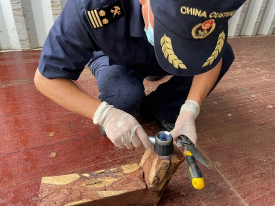 海关查验关员在对一批申报品名为“越柬紫檀”的货物进行查验时,发现该批散装木材树种及品名存在伪报嫌疑,现场关员立即联合风控部门进行取样送检。经鉴定,该批货物实际为黄檀木,蝶形花科黄檀属原木,属于《濒危野生动植物种国际贸易公约》附录II中的管制物种,即“濒危物种”。