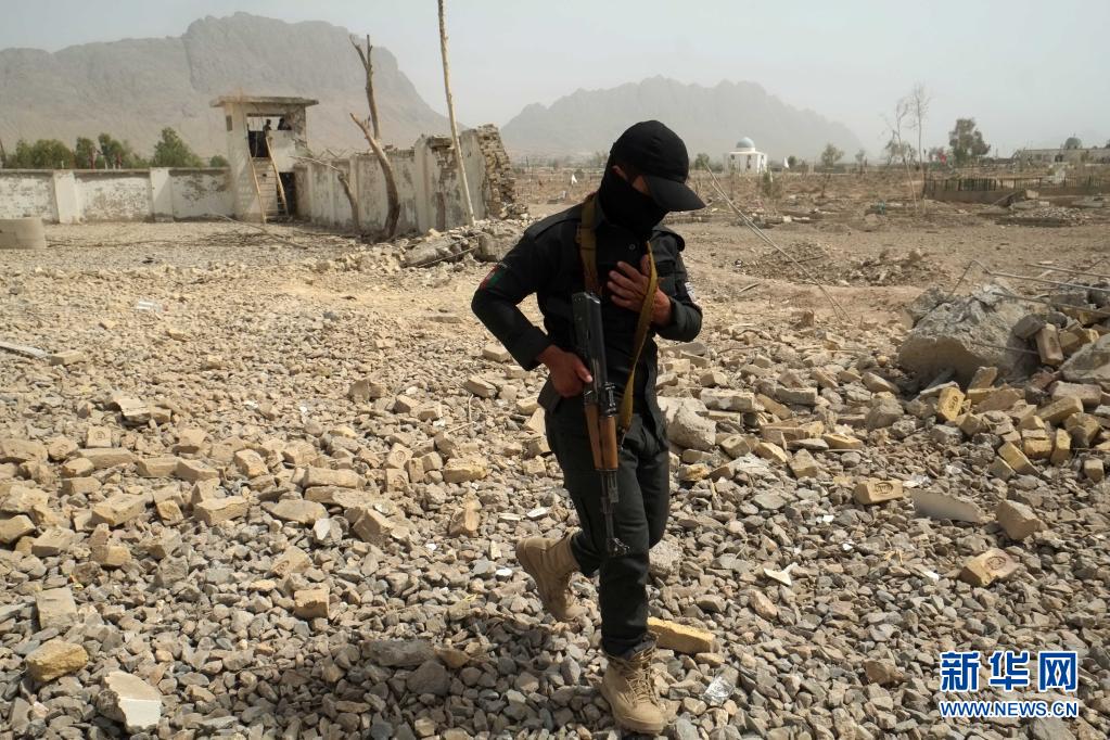 7月6日,阿富汗安全部队人员走在坎大哈市的爆炸袭击现场。