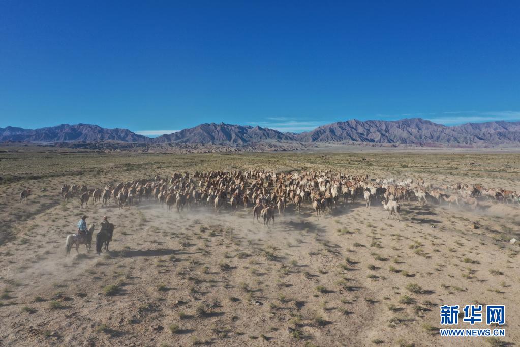 7月7日,阿克塞县红柳湾镇加尔乌宗村牧民赶着数百头骆驼前往夏季牧场(无人机照片)。