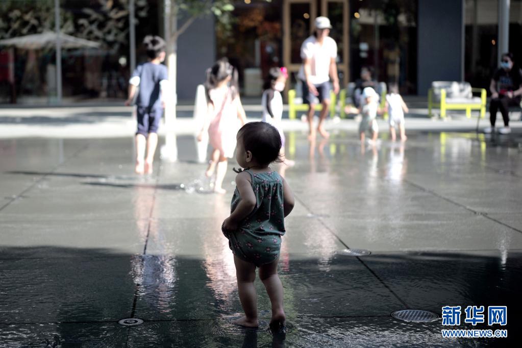 7月10日,儿童在美国旧金山湾区城市圣拉蒙一个购物中心前的广场上玩水。美国气象部门数据显示,美国刚刚送走有记录以来的“最热6月”,西部多州本周末又迎来新的热浪,预计持续至12日夜间。新华社记者 吴晓凌 摄