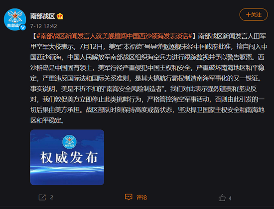 中国网军事7月12日讯 南部战区新闻发言人田军里空军大校表示,7月12日,美军“本福德”号导弹驱逐舰未经中国政府批准,擅自闯入中国西沙领海,中国人民解放军南部战区组织海空兵力进行跟踪监视并予以警告驱离。西沙群岛是中国固有领土,美军行径严重侵犯中国主权和安全,严重破坏南海地区和平稳定,严重违反国际法和国际关系准则,是其大搞航行霸权制造南海军事化的又一铁证。事实说明,美是不折不扣的“南海安全风险制造者”。我们对此表示强烈谴责和坚决反对,我们敦促美方立即停止此类挑衅行为,严格管控海空军事活动,否则由此引发的一切后果由美方承担。战区部队时刻保持高度戒备状态,坚决捍卫国家主权安全和南海地区和平稳定。
