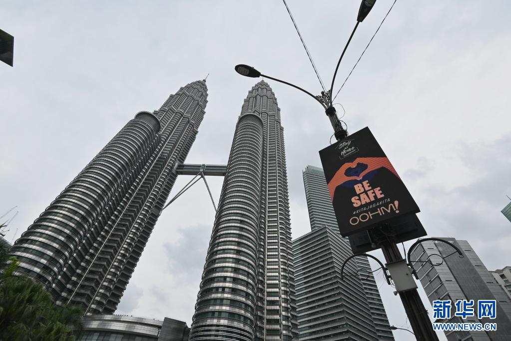 7月13日,在马来西亚吉隆坡的马来西亚国家石油公司双塔前,一块屏幕提示人们保持健康。