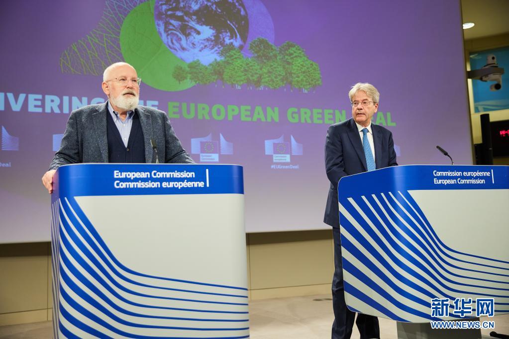 7月15日,欧盟委员会第一副主席蒂默曼斯(左)和负责经济事务的委员保罗·真蒂洛尼在比利时布鲁塞尔出席新闻发布会。
