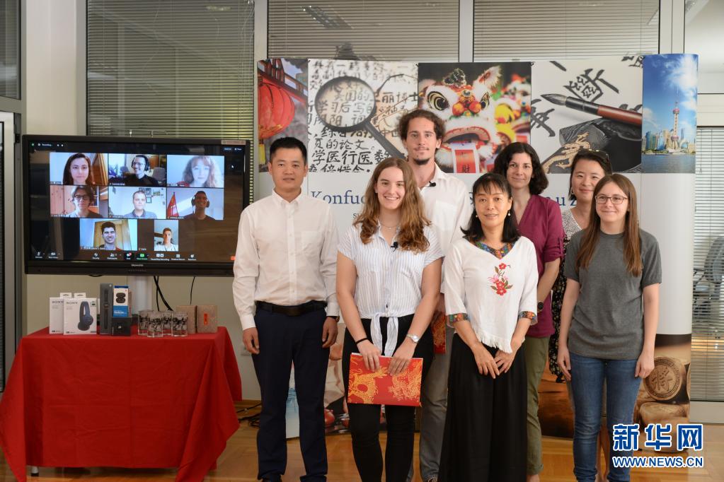 7月17日,在克罗地亚首都萨格勒布,参加“汉语桥”中文比赛的选手通过视频连线参赛。新华社记者 高磊 摄