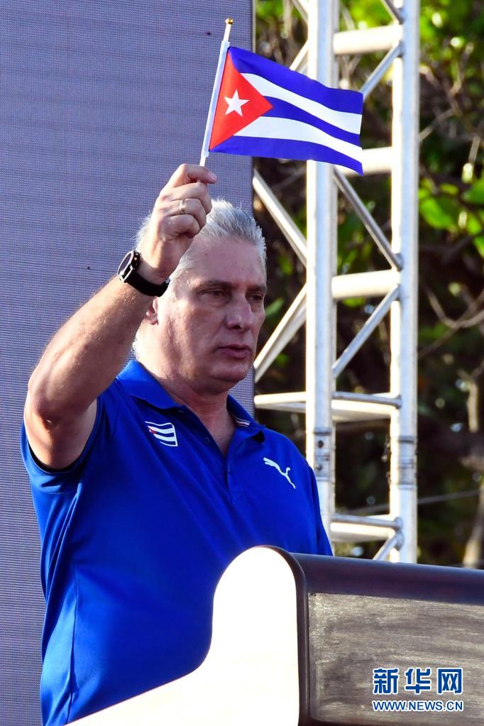7月17日,古共中央第一书记、古巴国家主席迪亚斯-卡内尔在哈瓦那举行的爱国集会上发表讲话。
