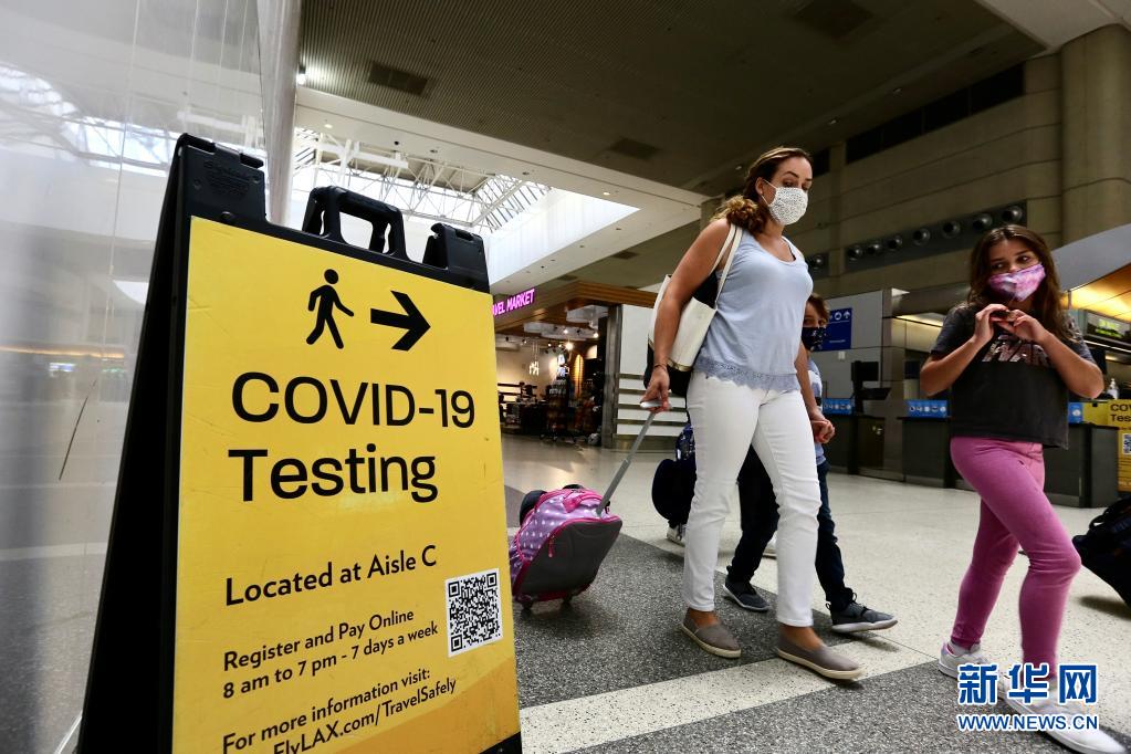 7月18日,佩戴口罩的旅客走过美国洛杉矶国际机场内的一块新冠检测告示牌。鉴于新冠感染和住院人数持续增加,美国洛杉矶县上周末开始恢复室内公共场所戴口罩的强制规定。这一行政令要求在室内公共场所的所有人都要戴上口罩,无论是否已接种新冠疫苗。这项“口罩令”定于17日午夜前生效。新华社发