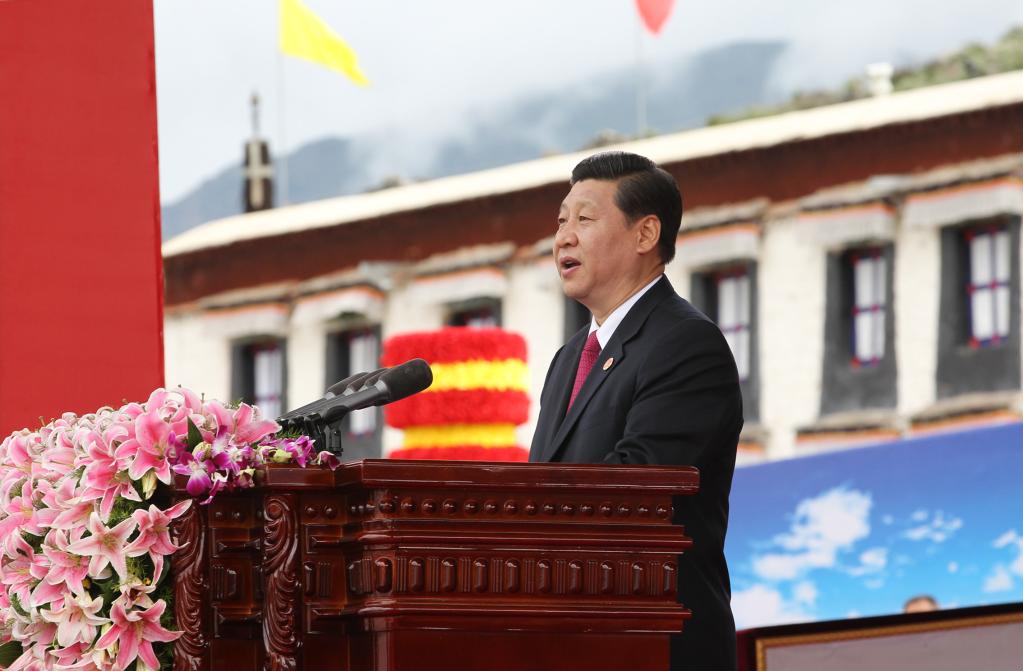 2011年7月19日,西藏和平解放60周年庆祝大会在拉萨举行。时任中共中央政治局常委、国家副主席、中央军委副主席、中央代表团团长习近平在庆祝大会上讲话。新华社记者 丁林 摄