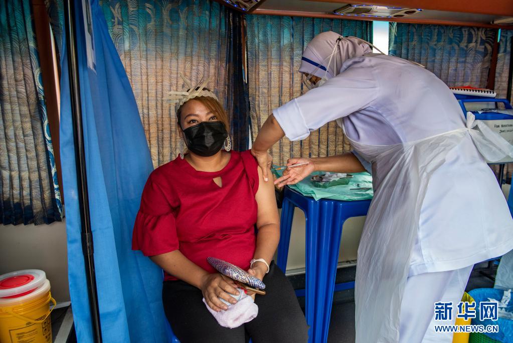 7月25日,马来西亚雪兰莪州凯里岛的一名居民在移动疫苗接种车上接种新冠疫苗。新华社发(张纹综摄)