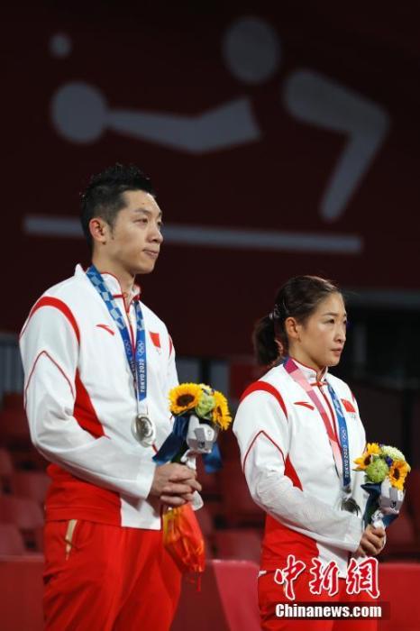 7月26日,东京奥运会决出了乒乓球项目的首枚金牌。在混双决赛中,中国组合许昕/刘诗雯在先胜2局的情况下遭遇逆转,以3:4惜败日本组合水谷隼/伊藤美诚,遗憾收获银牌。图为刘诗雯和许昕登上亚军领奖台。