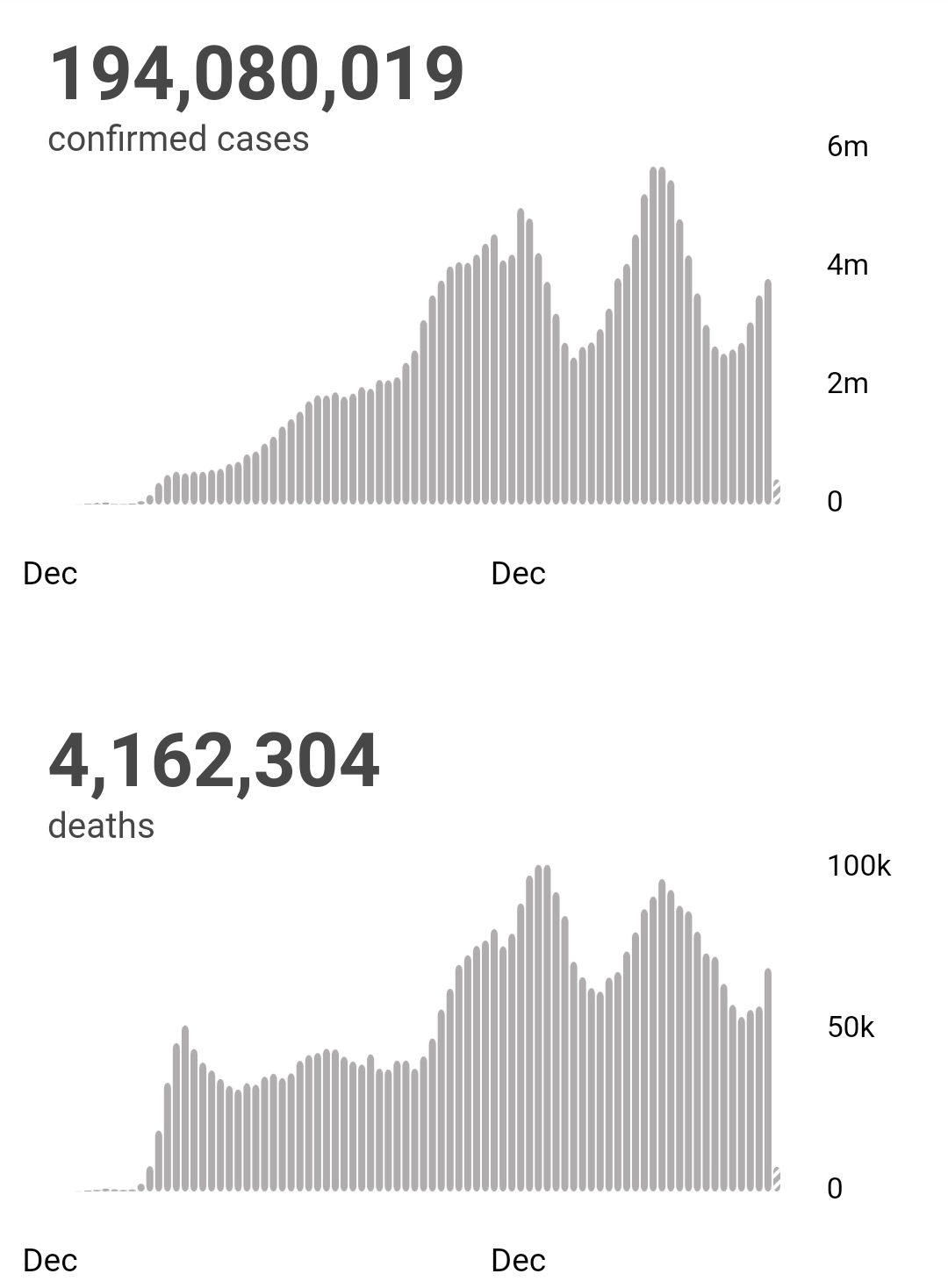 根据世卫组织最新实时统计数据,截至欧洲中部夏令时间7月26日18时28分(北京时间7月27日0时28分),全球累计新冠肺炎确诊病例194080019例,累计死亡病例 4162304例。26日全球新冠肺炎确诊病例新增422294例,死亡病例新增7644例。