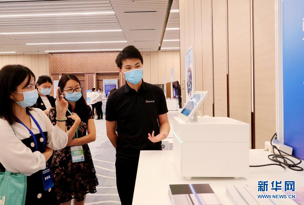 在国家会展中心(上海),第四届进博会食品及农产品展区、医疗器械及医药保健展区展前供需对接会的工作人员在介绍一台测序仪展品(7月26日摄)。新华社记者 方喆 摄