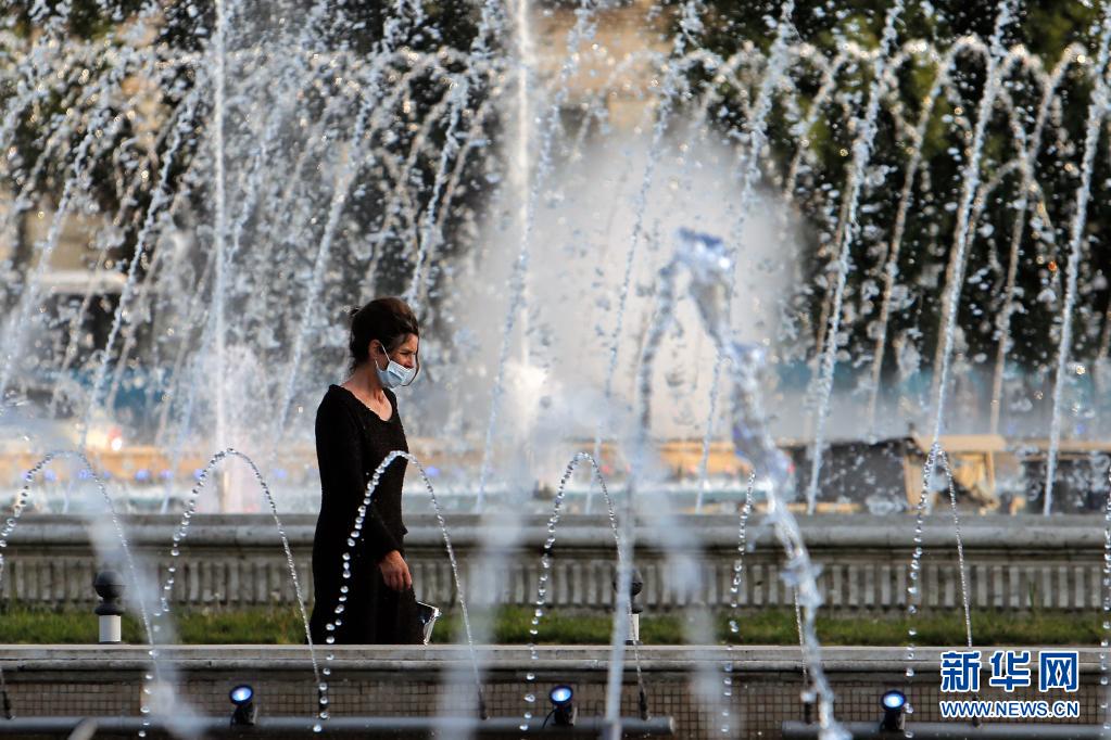 7月28日,在罗马尼亚首都布加勒斯特,一名女子经过一处喷泉池。