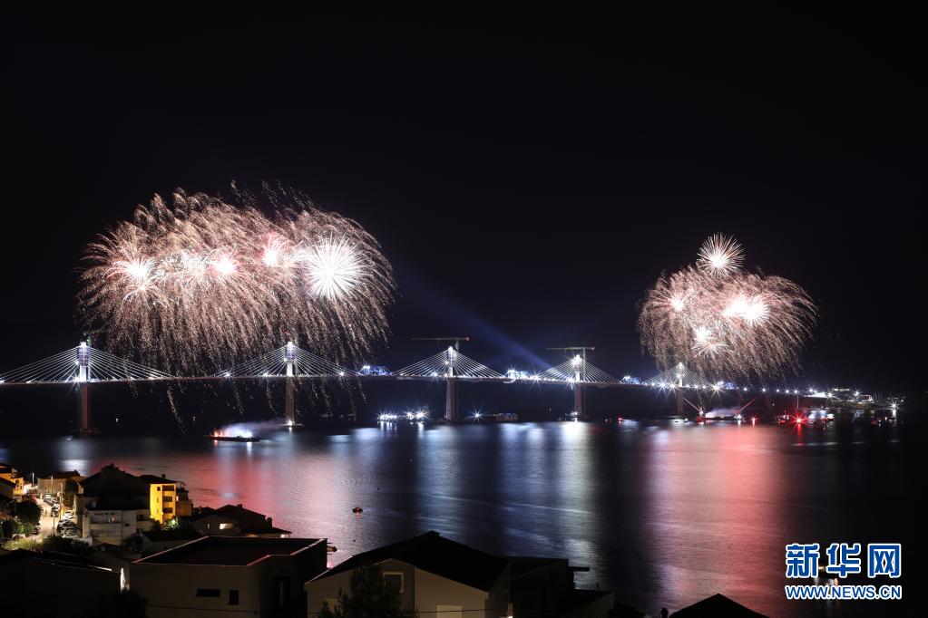 7月29日凌晨,在克罗地亚南部的小斯通湾,为庆祝佩列沙茨大桥合龙的焰火表演照亮海面。新华社发(卡加利耶摄)