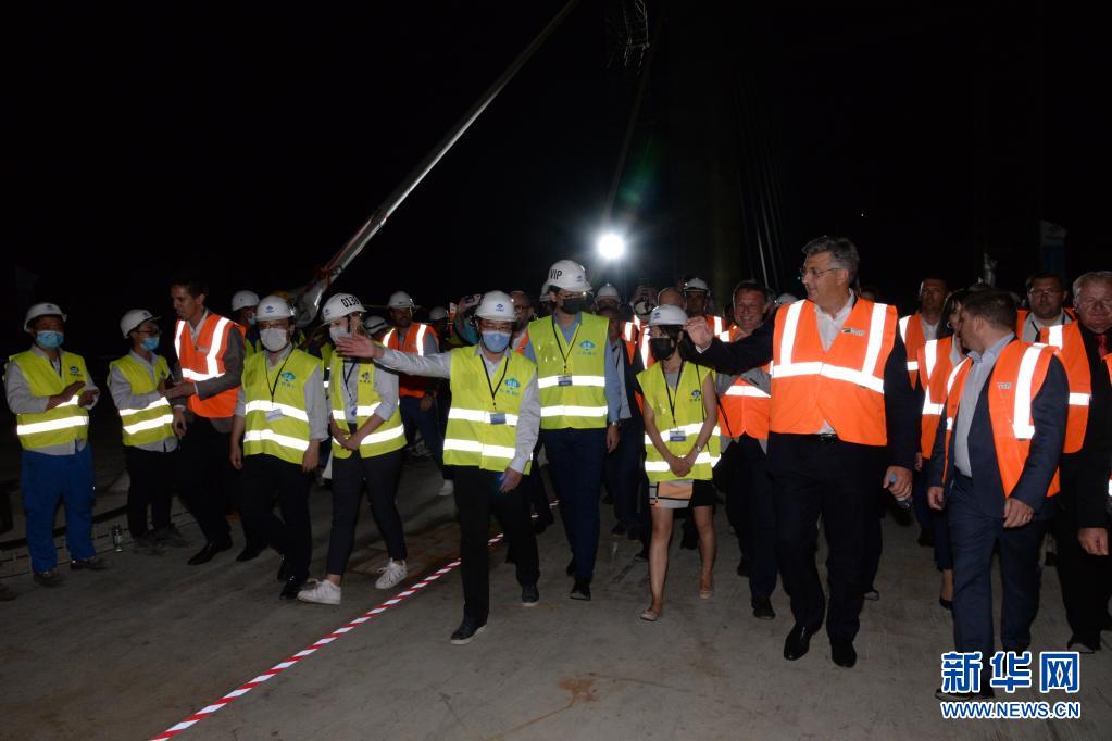 7月29日凌晨,克罗地亚总理普连科维奇(前右二)在佩列沙茨大桥上向中国建设者招手致意。新华社记者 高磊 摄