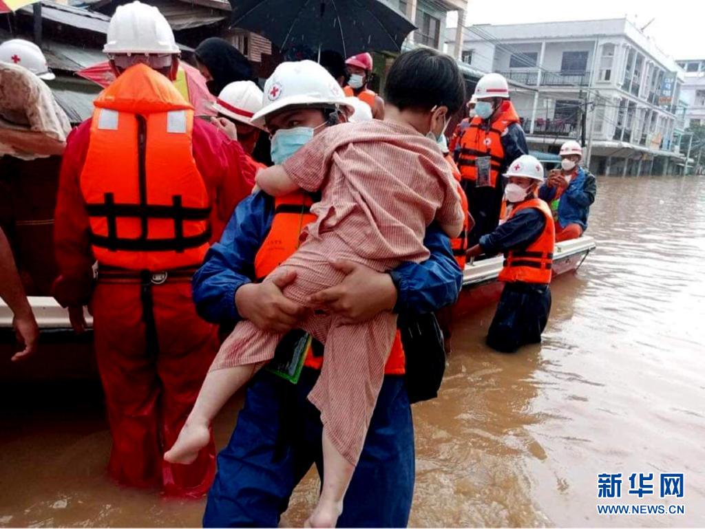 7月28日,救援人员在缅甸克伦邦渺瓦底转移受灾群众。新华社发