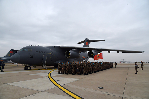 一批增援武汉的军队医护人员乘坐国产运-20运输机抵达武汉天河机场(2020年2月13日摄)。新华社记者 黎云 摄