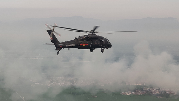 7月24日,陆军第83集团军某旅出动直-20直升机向河南省新乡市辉县洪州乡、峪河镇等地投送物资(手机拍摄)。新华社发(朱文海 摄)
