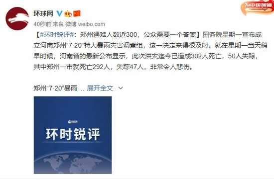 国务院星期一宣布成立河南郑州“7·20”特大暴雨灾害调查组,这一决定来得很及时。就在星期一当天稍早时候,河南省的最新公布显示,此次洪灾迄今已造成302人死亡,50人失踪,其中郑州一市就死亡292人,失踪47人,非常令人悲伤。