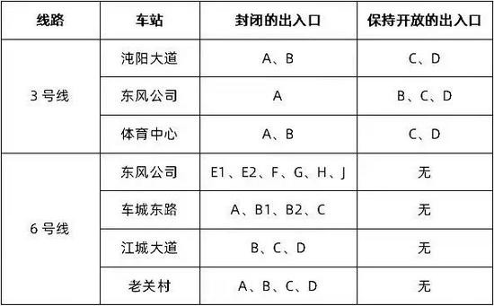 3号线 关闭的出入口为:沌阳大道A、B口,东风公司A口,体育中心A、B口。