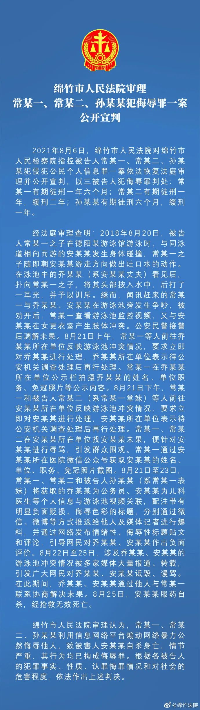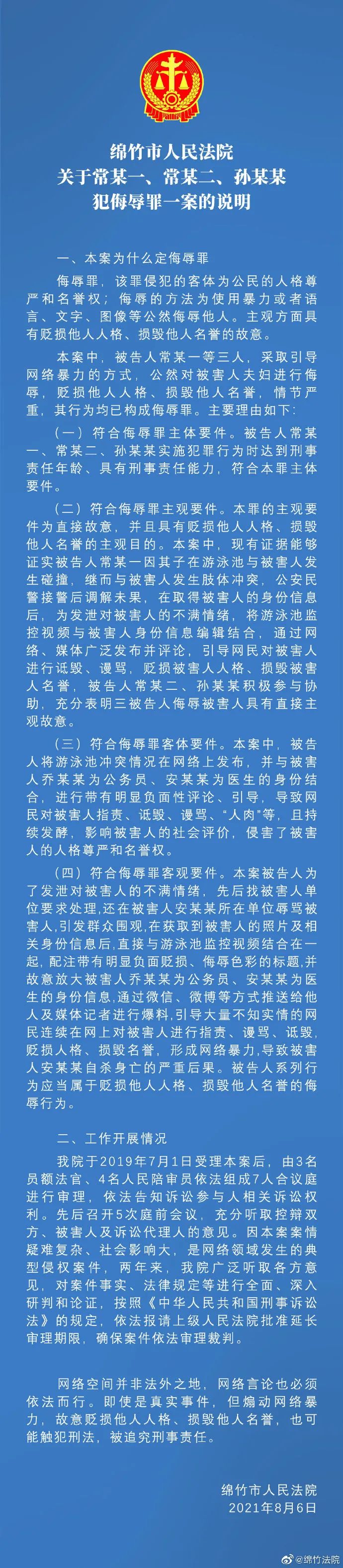 8月6日,四川绵竹市人民法院对德阳女医生遭网暴后自杀案宣判。法院审理认为,常某一、常某二、孙某某在网上煽动网络暴力,公然侮辱他人,致被害人安女士自杀身亡,其行为均已构成侮辱罪。三人分别获刑一年半、一年缓刑两年、半年缓刑一年。