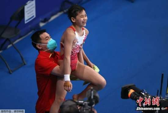 当看到大屏幕上显示自己是冠军后,全红婵的主管教练刘犇一把抱起了弟子,把她举得高高的,庆祝胜利。