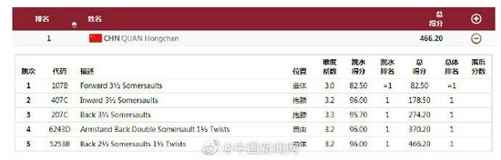 值得一提的是,全红婵的整套动作满分为477分。在决赛的五跳中,她三次跳出满分动作。