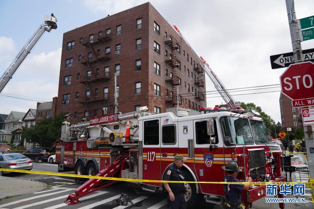 8月10日,消防员在美国纽约发生火灾的居民楼附近工作。