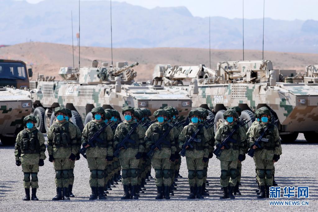 8月13日,俄方陆军方队在“西部·联合-2021”演习结束仪式上整齐列队。新华社记者 刘芳 摄