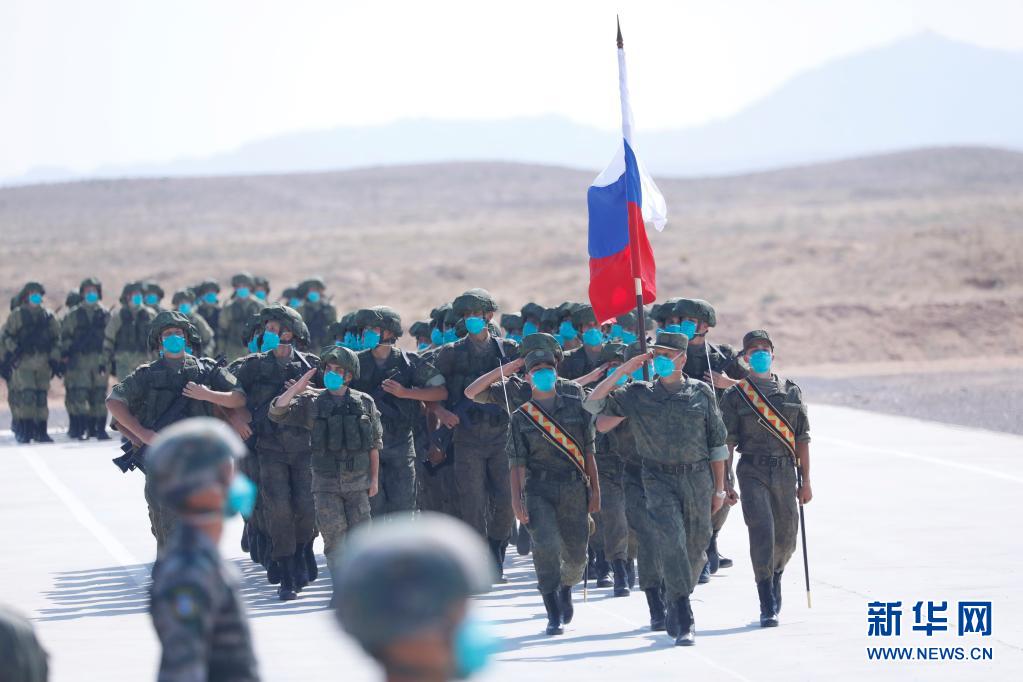 8月13日在“西部·联合-2021”演习结束仪式上拍摄的俄方护旗队和陆军方队。新华社记者 刘芳 摄