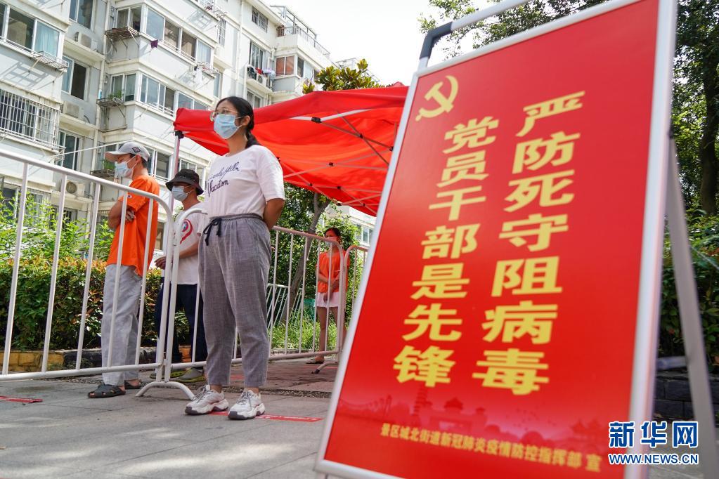 8月17日,市民在扬州市梅岭街道鸿福二村核酸采样点排队,准备进行核酸检测取样。新华社记者 李博 摄