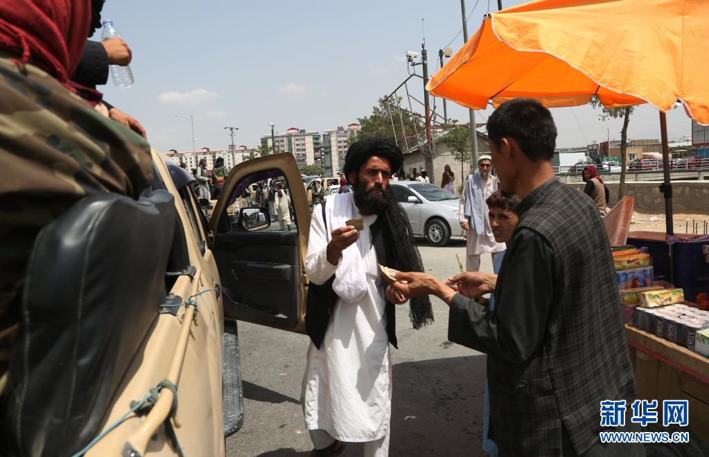 8月17日,阿富汗塔利班成员在喀布尔街头向小贩购物。