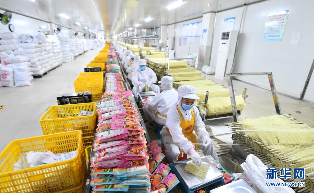 工人在柳州市乐哈哈食品科技有限公司生产车间生产线上包装米粉(6月5日摄)。柳州螺蛳粉是广西著名小吃,也是国家级非物质文化遗产。近年来,柳州市用工业化理念推动螺蛳粉全产业链高质量发展,逐步实现了自动化、智能化、规模化生产,创造就业岗位30多万个,帮助5500多户贫困户、2.8万贫困人口实现脱贫。