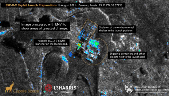 这些照片是商业卫星成像公司Capella Space于8月16日拍摄的,米德尔伯里国际防扩散研究中心的专家分析了这些照片后认为,近期俄罗斯准备试射“雨燕”核动力巡航导弹。